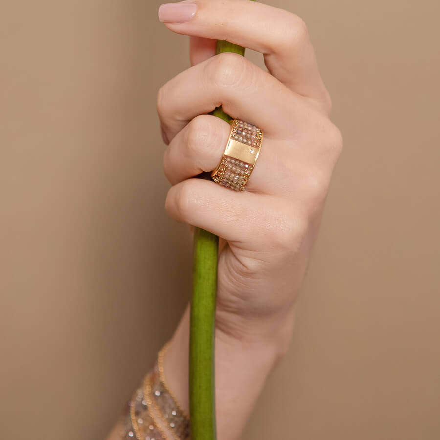 Anel em ouro 18k amarelo com safiras coloridas e brilhante.