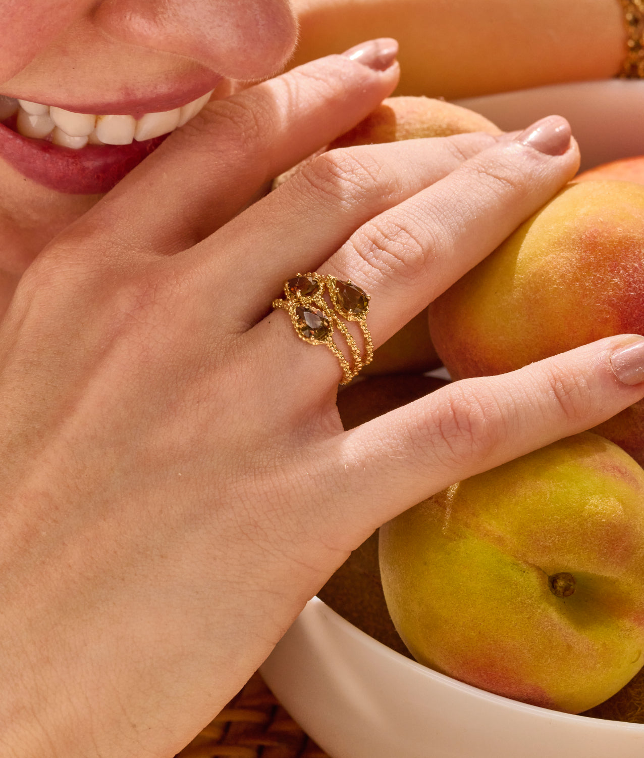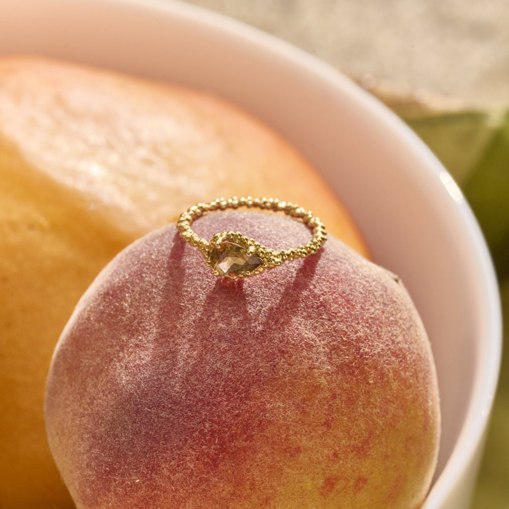 Confeccionado em ouro amarelo 18k, o anel apresenta uma andaluzita com lapidação gota, destacada por nuances que transitam entre tons terrosos e esverdeados — marca registrada da gema e de sua beleza única. O aro, composto por bolinhas polidas, criam volume, textura e luminosidade característicos da coleção Essência. É um anel versátil que pode ser usado sozinho, revelando toda a delicadeza do seu design, ou fazendo uma combinação com duas ou mais peças. Quando usados juntos, os anéis se encaixam de forma harmônica, criando um mix moderno, repleto de estilo e autenticidade.