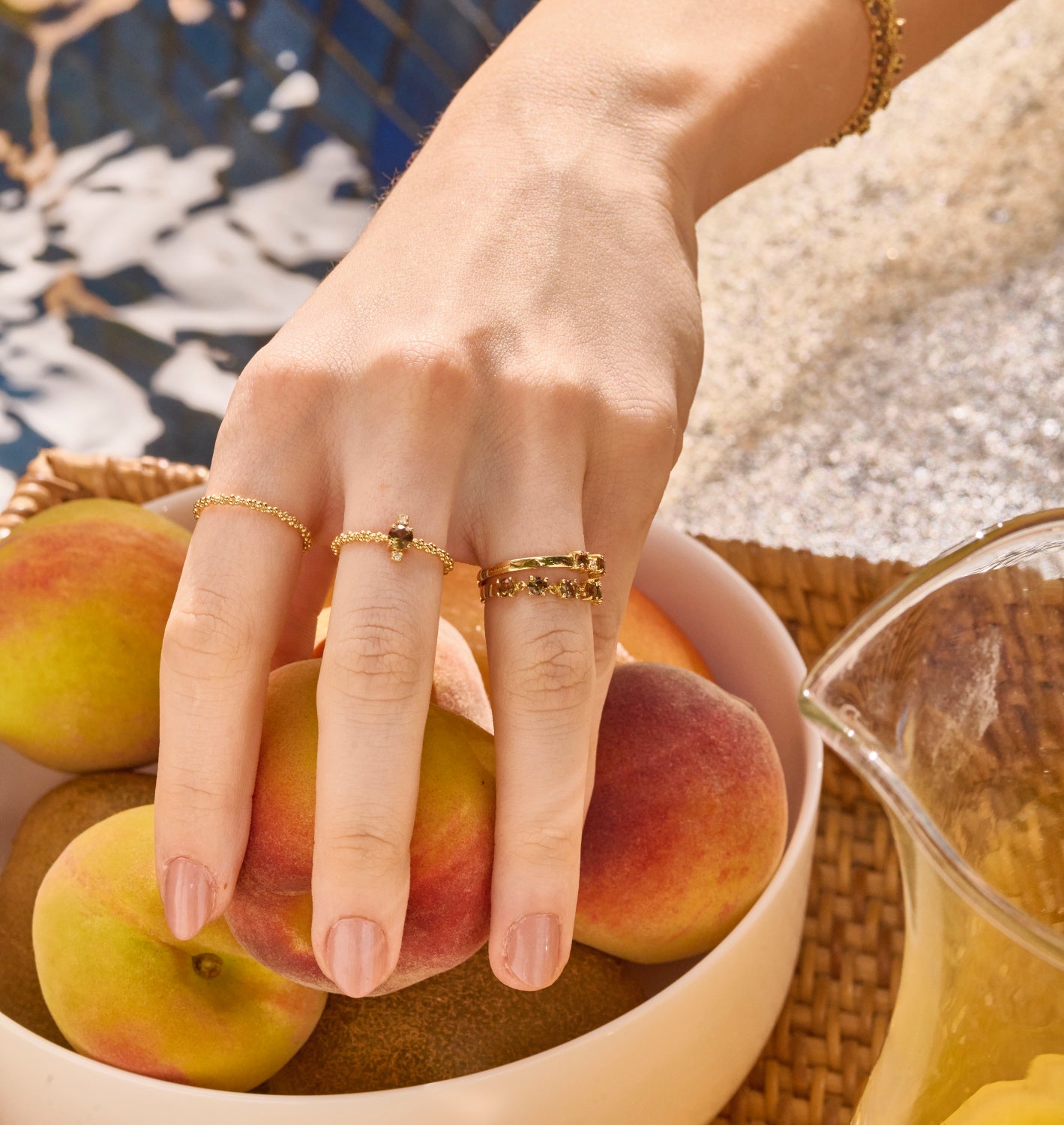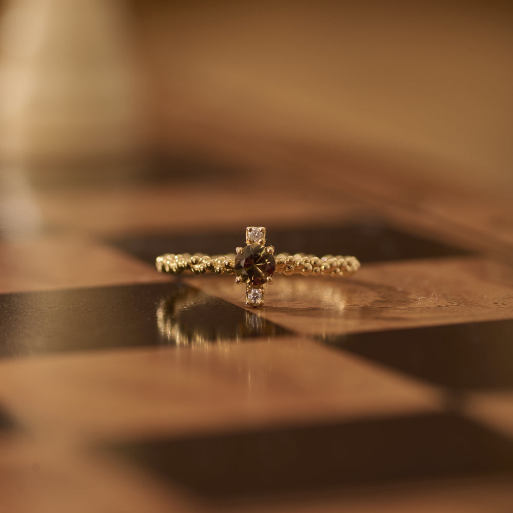 Confeccionado em ouro amarelo 18k, o anel combina a textura das bolinhas polidas com o brilho das gemas. No centro, uma andaluzita de 4 mm revela sua beleza singular, marcada por nuances que transitam entre tons terrosos e esverdeados. Ao lado dela, dois brilhantes — totalizando 0,02 ct — acrescentam pontos sutis de luminosidade. A peça faz parte da coleção Essência, que celebra o encontro entre naturalidade e sofisticação — uma joia leve e delicada, pensada para te acompanhar tanto no dia a dia quanto em momentos mais especiais.