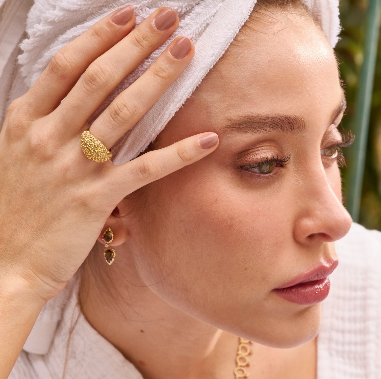 Confeccionado em ouro amarelo 18k, o anel apresenta um design composto por bolinhas polidas que refletem a luz de forma intensa e fluida. Entre elas, 13 brilhantes — totalizando 0,13 ct — são delicadamente distribuídos, criando pontos de brilho que realçam a textura exuberante da peça. Parte da coleção Essência, o anel celebra o que é puro e fundamental: formas naturais, luminosidade e presença. Uma joia marcante e atemporal, pensada para acompanhar momentos de força, beleza e autenticidade.