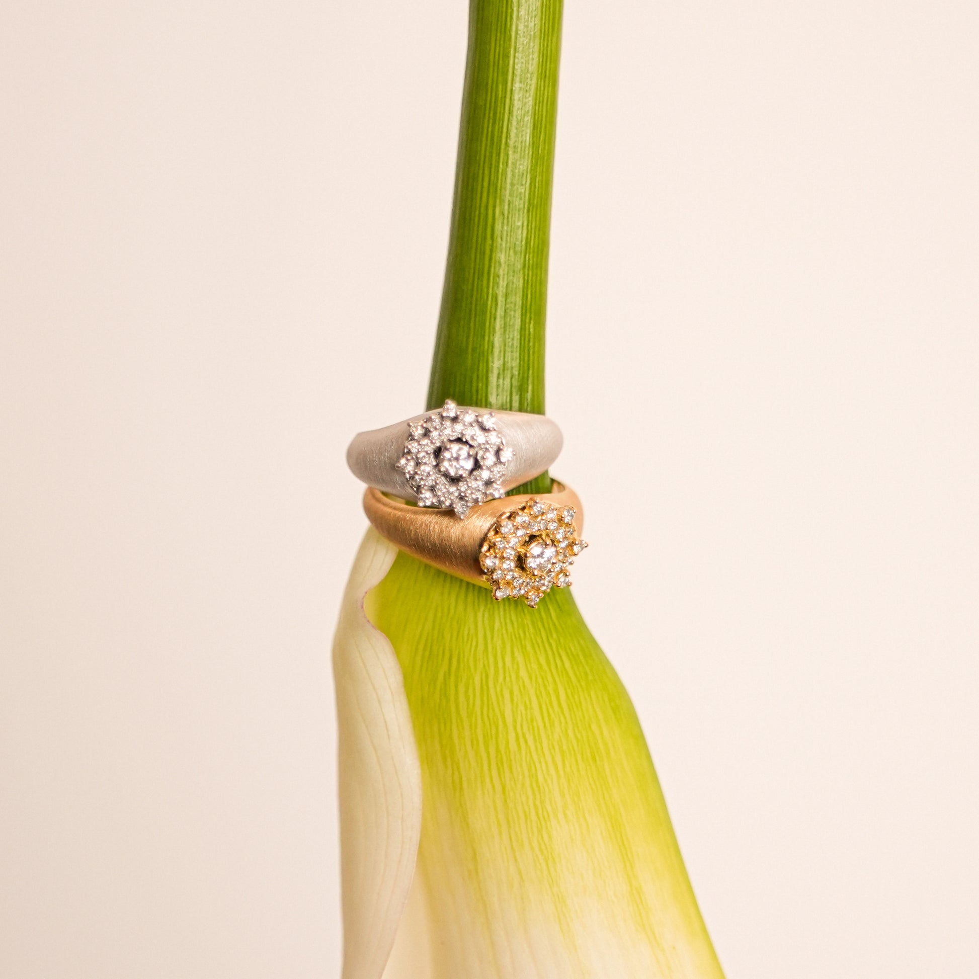 Seu design é marcado por uma flor central composta por 33 diamantes, que totalizam 0,24ct — sendo 1 brilhante de 8pts, 8 de 0,008ct e 24 de 0,004ct. O contraste entre o aro de acabamento fosco e o brilho intenso dos diamantes, garantem sofisticação e modernidade à peça. A linha EVA também conta com modelos de colar, pingente e brincos.