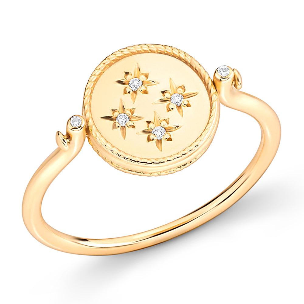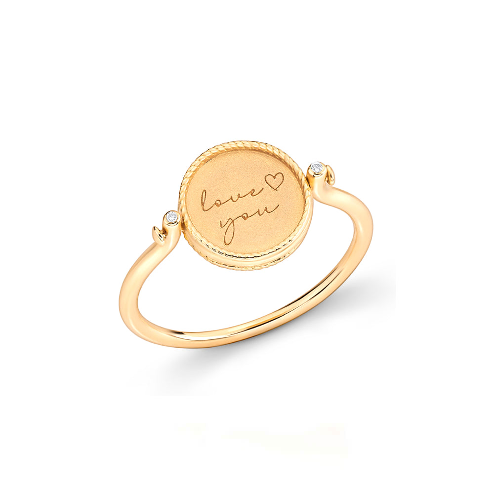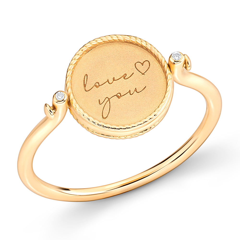 O Anel Imprint Giratório Redondo é confeccionado em ouro 18k e conta com 0,03ct de diamantes. De um lado, apresenta uma placa lisa com a gravação “love you” e um coração, em acabamento fosco feito com jato de areia. Do outro, exibe quatro diamantes de 0,005ct cada, com cravação estrela e acabamento polido. O aro delicado e polido é adornado por dois diamantes em cada extremidade, trazendo ainda mais brilho e charme à peça.