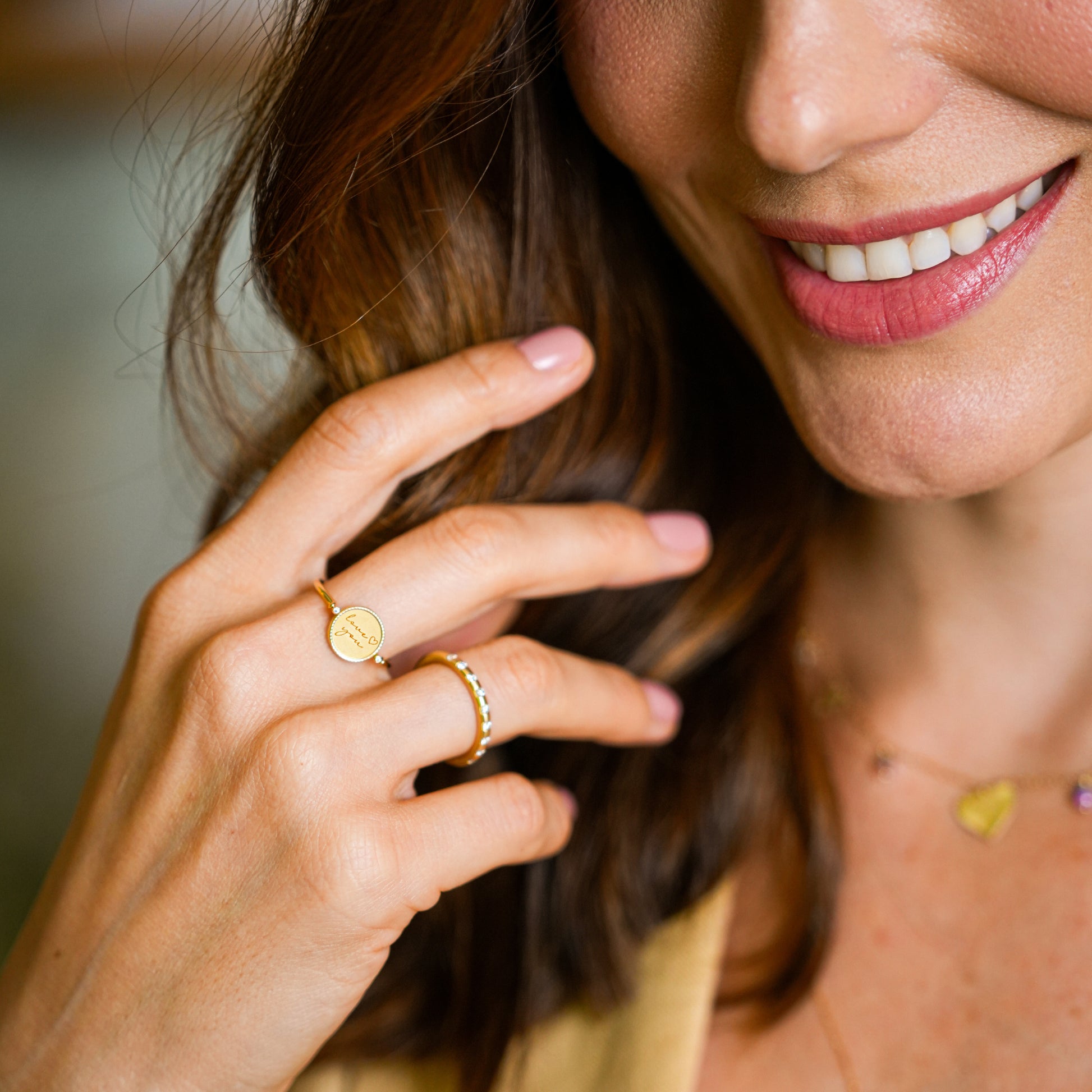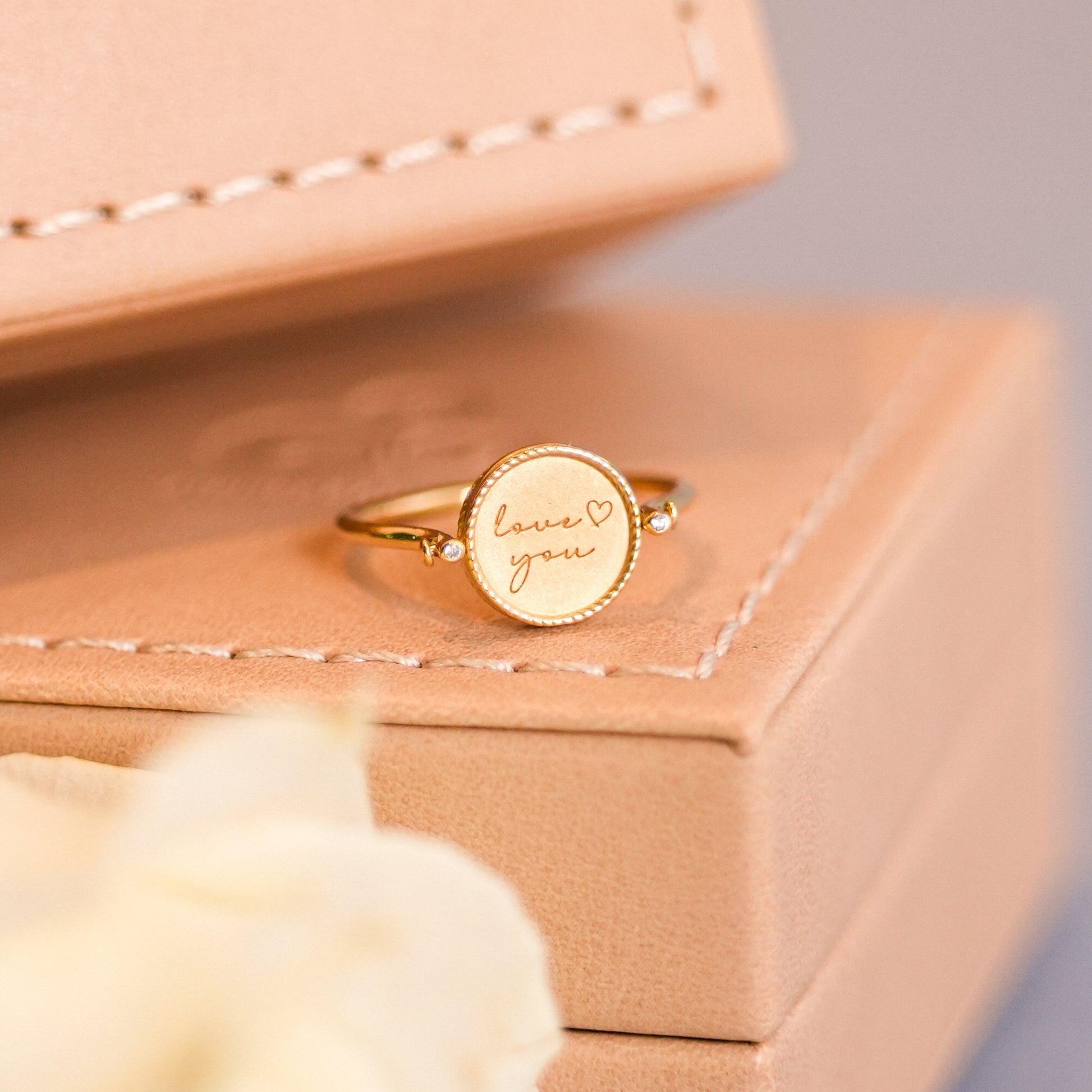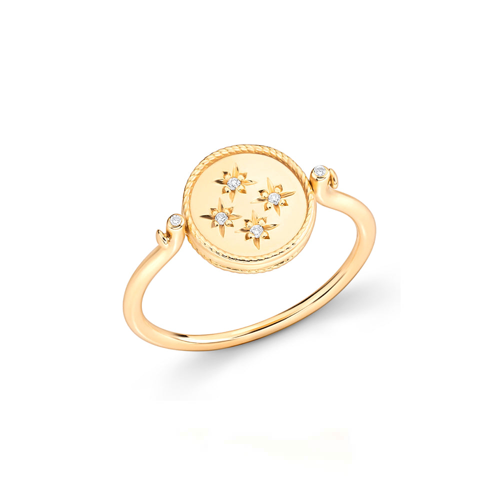O Anel Imprint Giratório Redondo é confeccionado em ouro 18k e conta com 0,03ct de diamantes. De um lado, apresenta uma placa lisa com a gravação “love you” e um coração, em acabamento fosco feito com jato de areia. Do outro, exibe quatro diamantes de 0,005ct cada, com cravação estrela e acabamento polido. O aro delicado e polido é adornado por dois diamantes em cada extremidade, trazendo ainda mais brilho e charme à peça.
