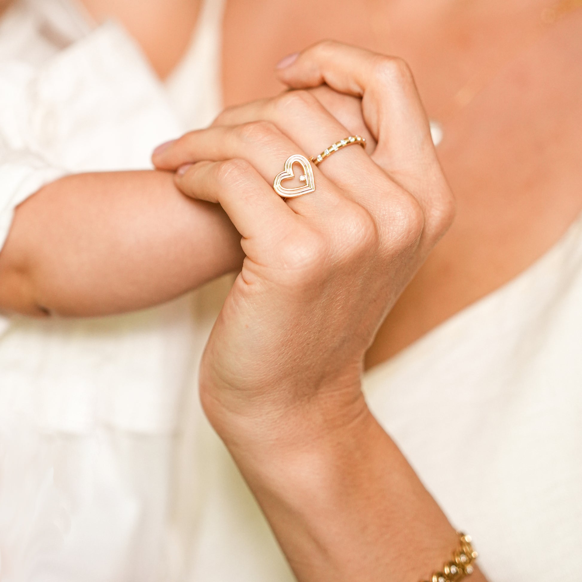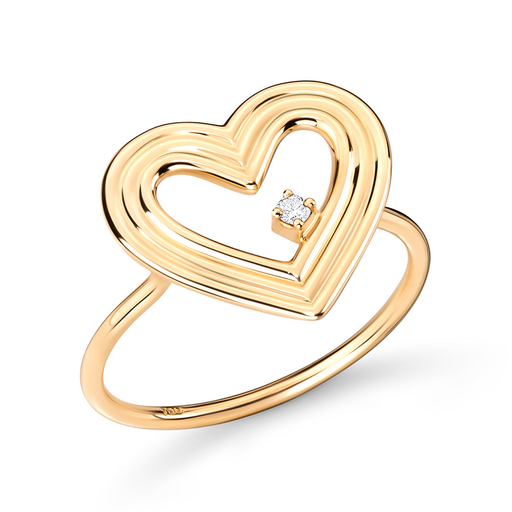 No centro da peça, um coração feito com três fios de ouro, contendo um diamante de 0,015 ct com lapidação brilhante. O acabamento totalmente polido garante um brilho intenso e sofisticado, valorizando cada detalhe da joia. Além do anel, a linha completa inclui um brinco com diamantes em cascata e um colar com diamantes e loopings de turmalinas rosas.