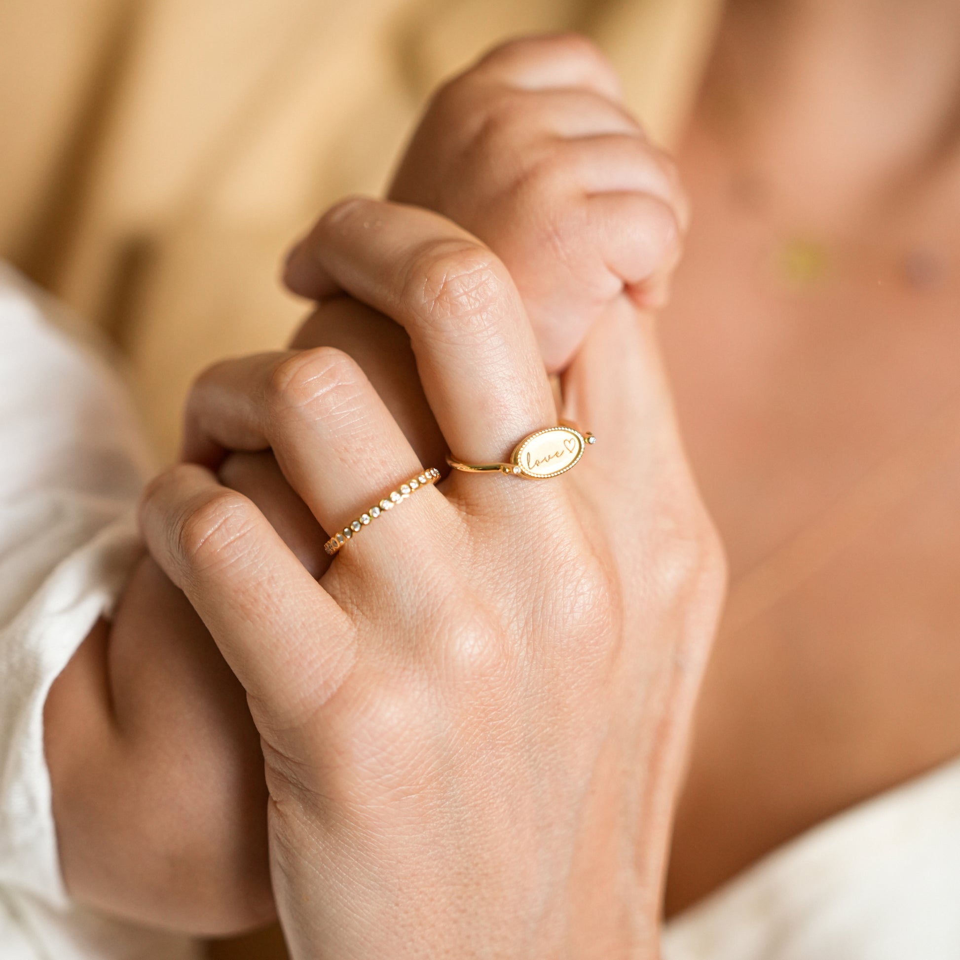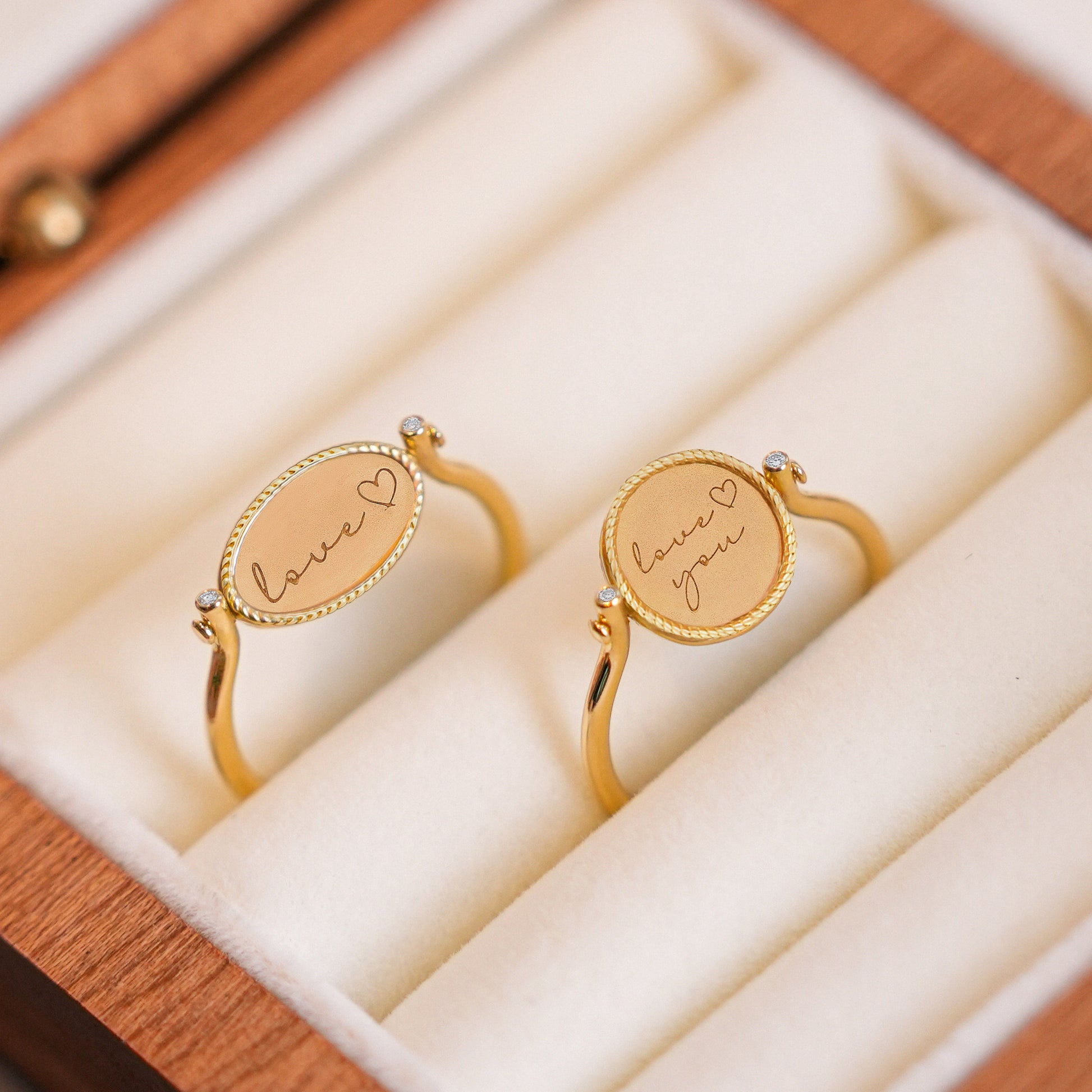 O Anel Imprint Giratório Oval é confeccionado em ouro 18k e conta com 0,025ct de diamantes. De um lado, apresenta uma placa lisa com a gravação “love” e um coração, em acabamento fosco feito com jato de areia. Do outro, exibe três diamantes de 0,005ct cada, com cravação estrela e acabamento polido. O aro delicado e polido é adornado por dois diamantes em cada extremidade, trazendo ainda mais brilho e charme à peça.