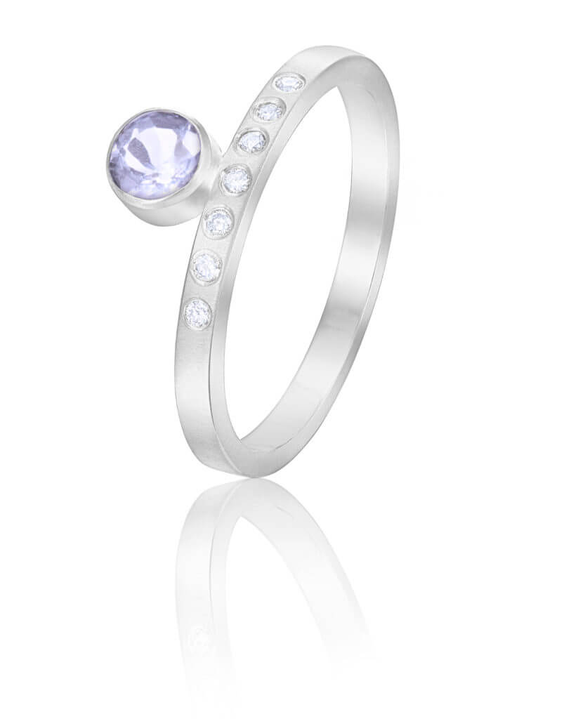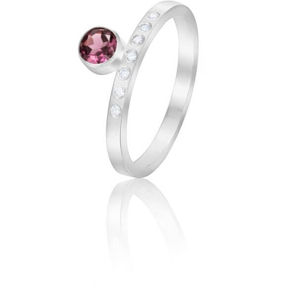 Anel em ouro 18k branco com Brilhantes, totalizando 0,056 ct e no centro Rodolita ou Tanzanita.