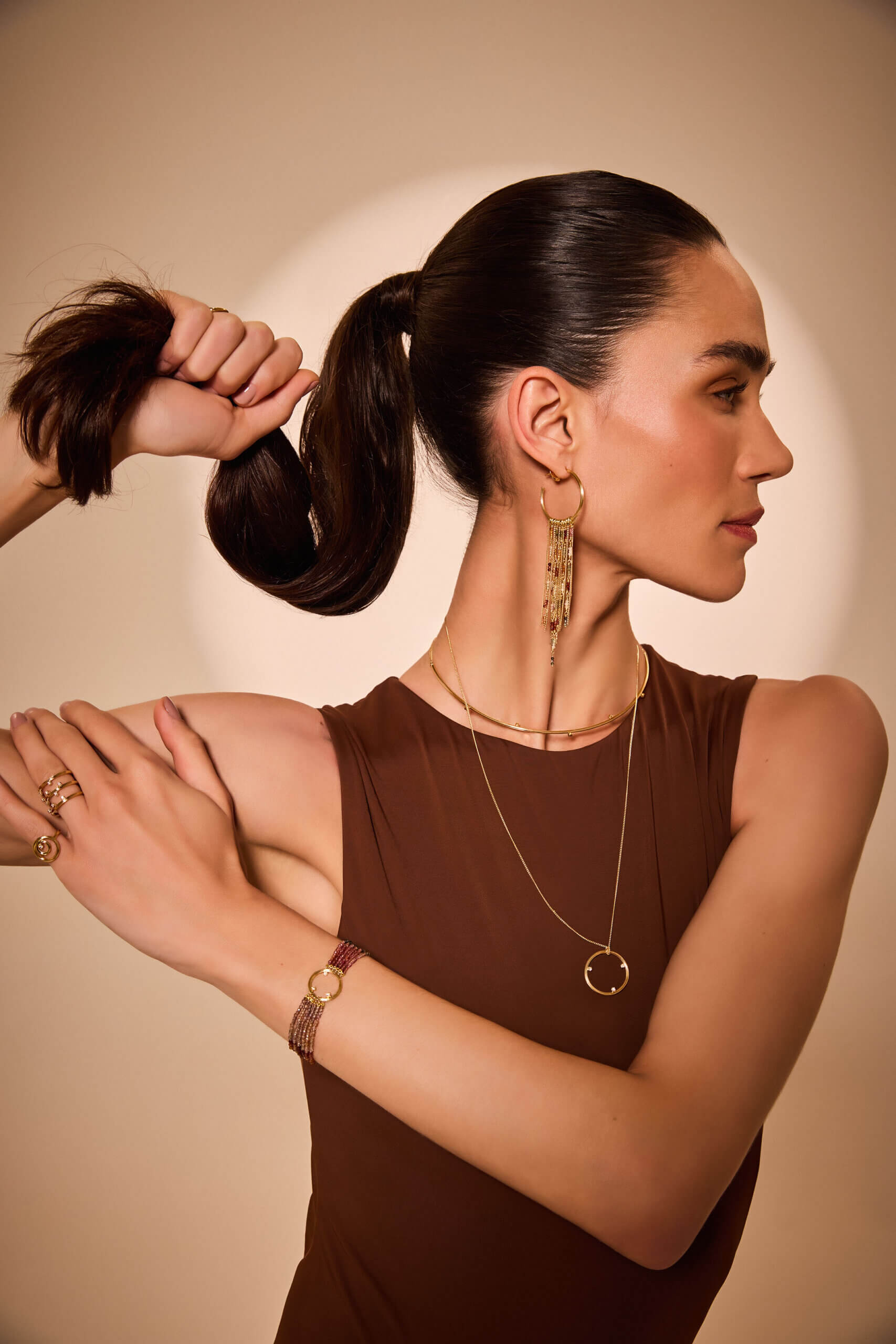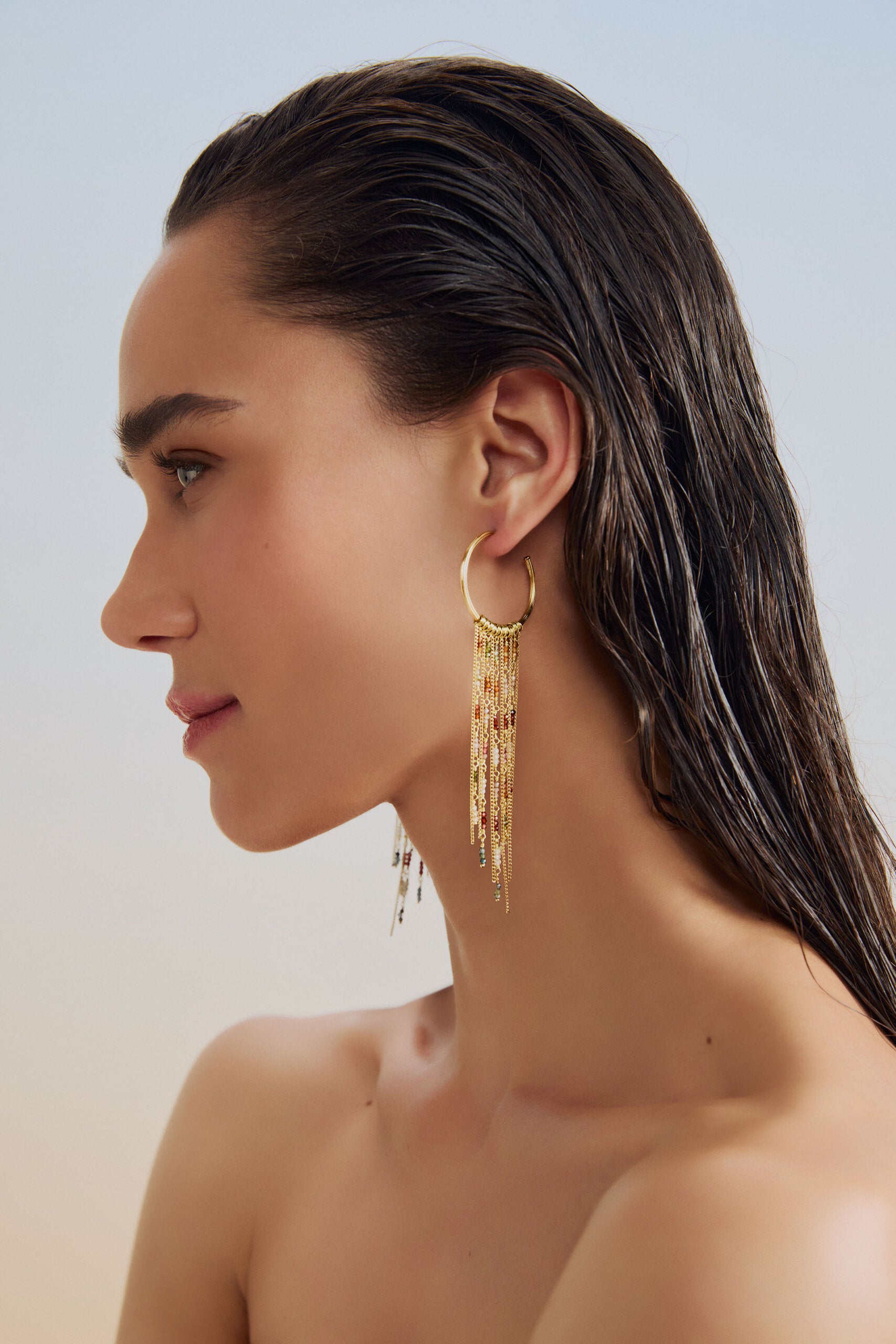 A coleção Golden Hour é inspirada na magia dos raios solares durante a hora dourada, quando a luz cria sombras suaves e transforma tudo ao redor com um brilho único. Feitas com fios raiados e detalhes que evocam movimento e fluidez, as joias desta coleção capturam a leveza e a harmonia desse momento especial.