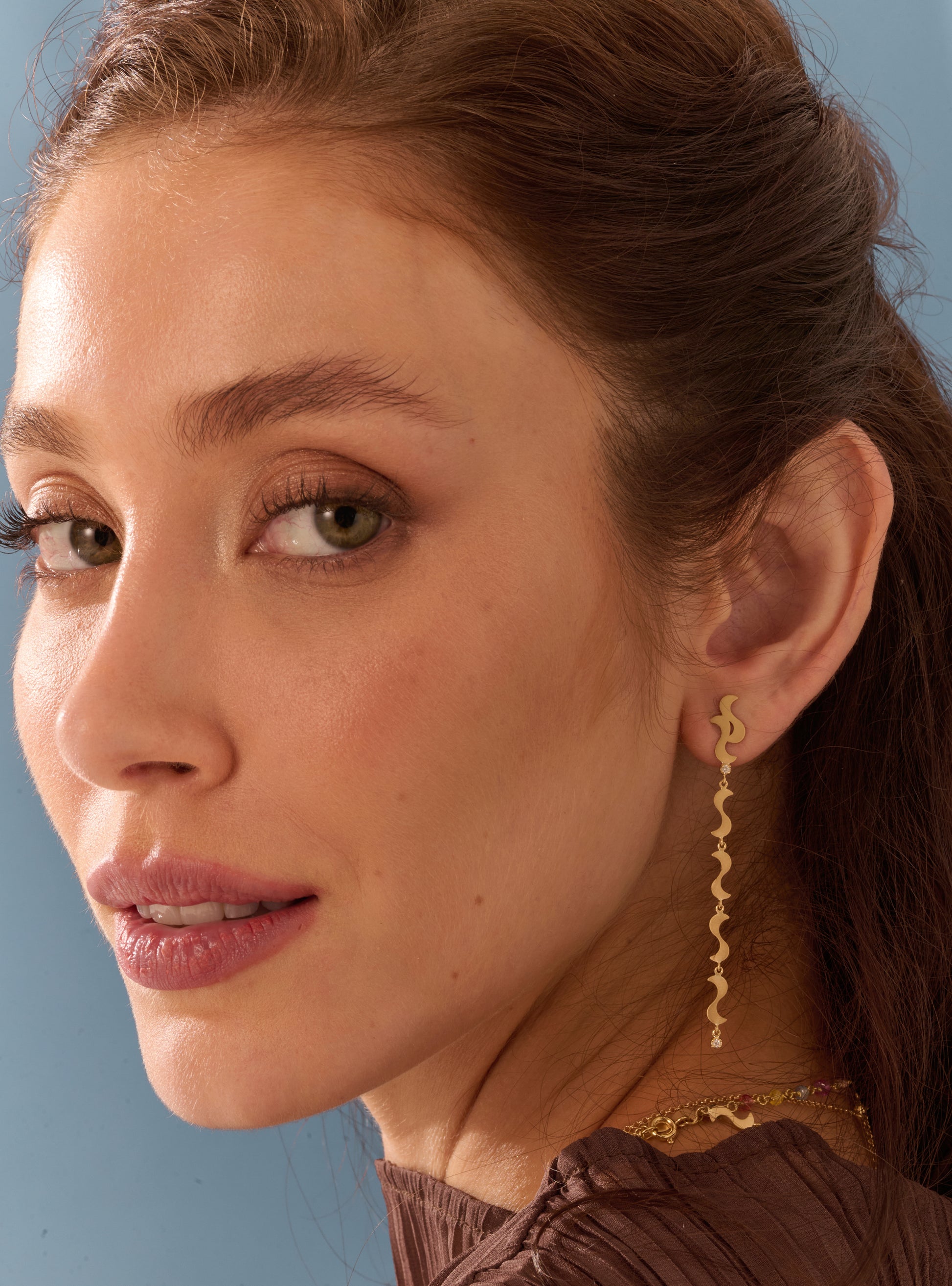 Confeccionado em ouro amarelo 18k e traz o movimento fluido e orgânico característico da coleção Bossa. Seu design forma uma linha vertical fluida e alongada, finalizado com quatro diamantes que totalizam 0,08ct, que acrescentam um brilho sutil e refinado à peça. Uma joia que celebra a bossa do Rio — o luxo despretensioso e a beleza do movimento.