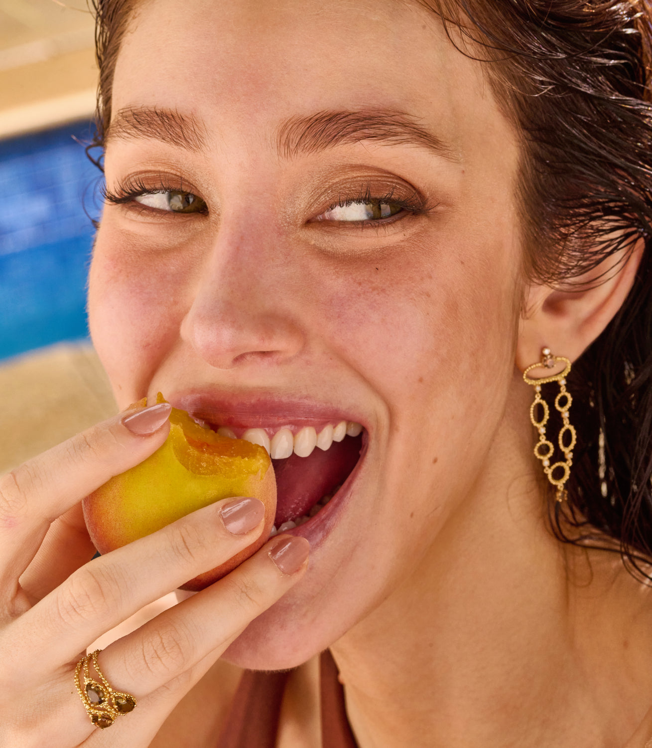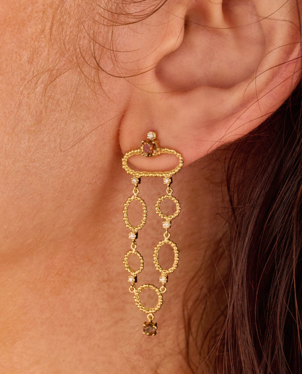 Confeccionado em ouro amarelo 18k, contendo 14 brilhantes - totalizando 0.16 ct - e 4 andaluzitas redondas, de 4mm e 3mm.