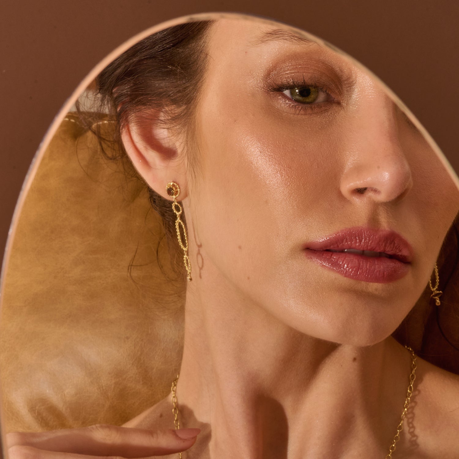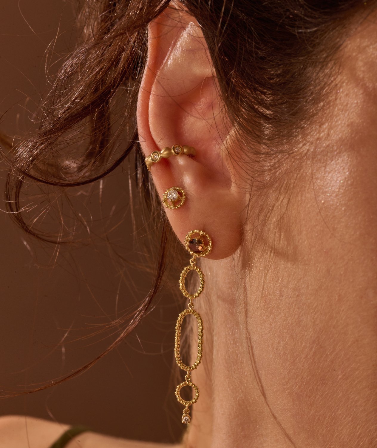 Confeccionado em ouro amarelo 18k, contendo duas andaluzitas com lapidação gota de 4mm e dois brilhantes, totalizando 0.04 ct.