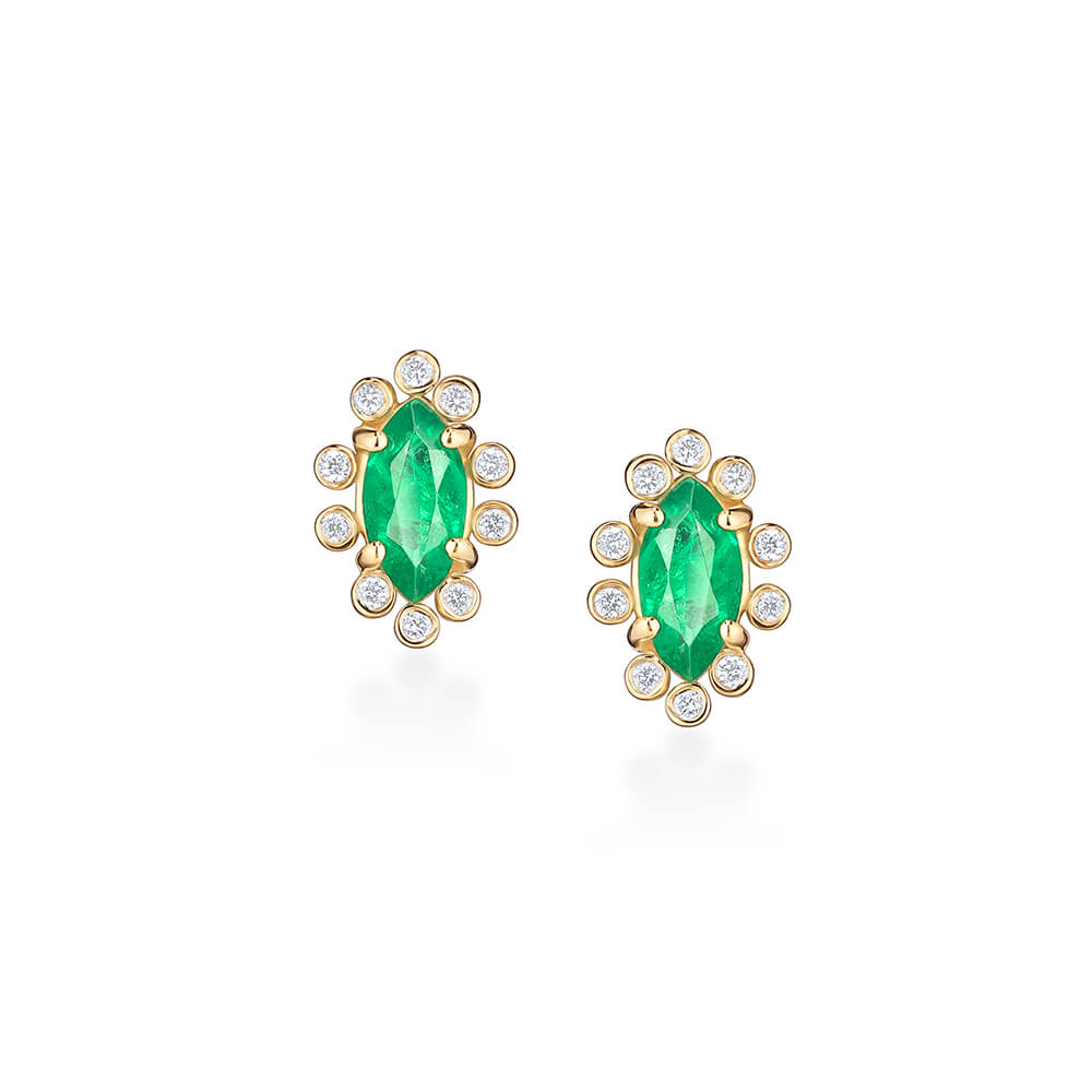 Brinco Espeto Esmeralda Navete com Brilhantes 18k