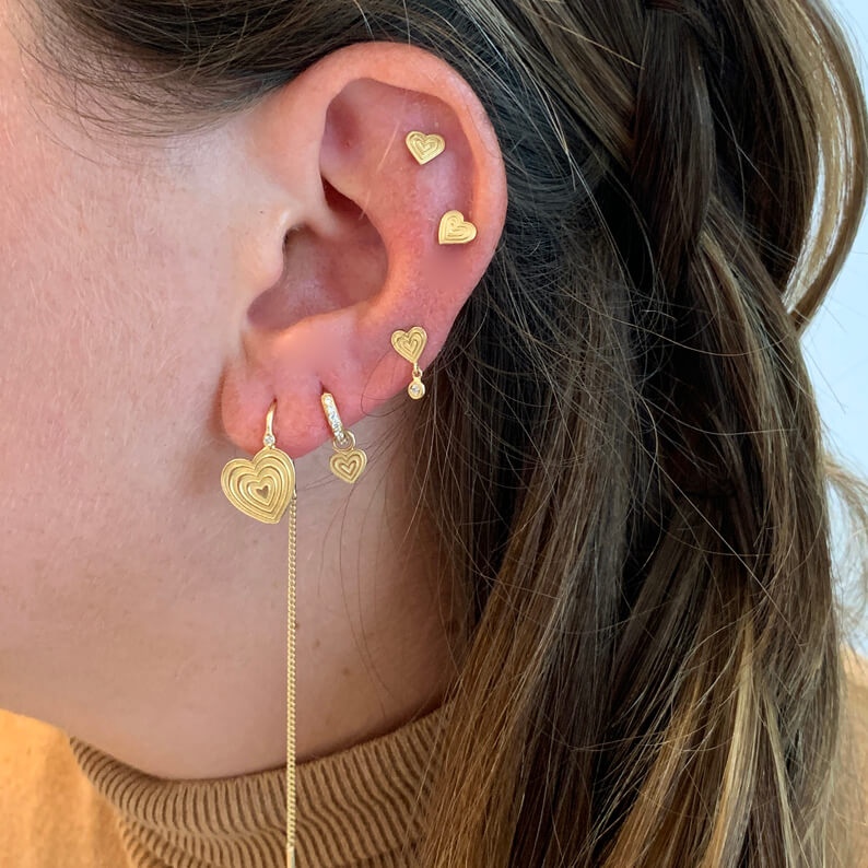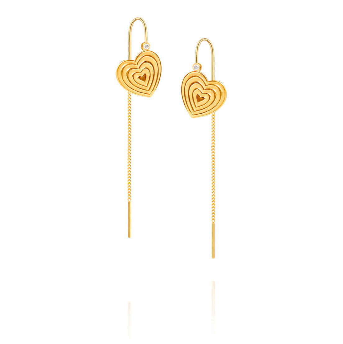 Brinco em ouro 18k amarelo ou branco com diamante, medindo 7cm de comprimento. Coração mede 1,2cm.
