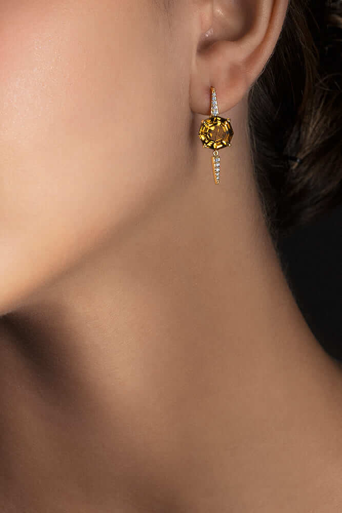 Brinco em ouro 18k amarelo com citrino e 0,17ct brilhantes. Mede 3cm de comprimento.