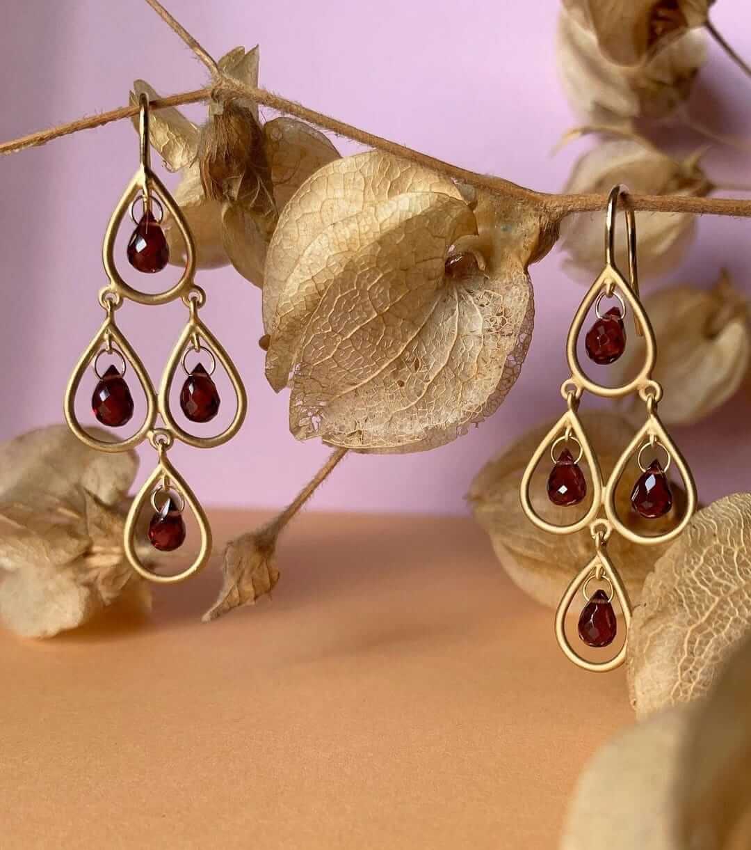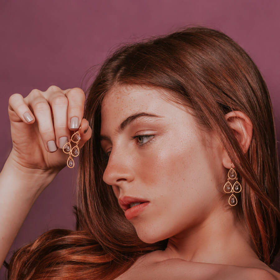 Apesar de ter sido lançado há mais de 15 anos, é um brinco que estará sempre atual. Linda granadas conhecidas como a pedra do amor ou cristais lapidados em formato Briolet são penduradas entre as gotas de ouro dando um movimento especial ao brinco.