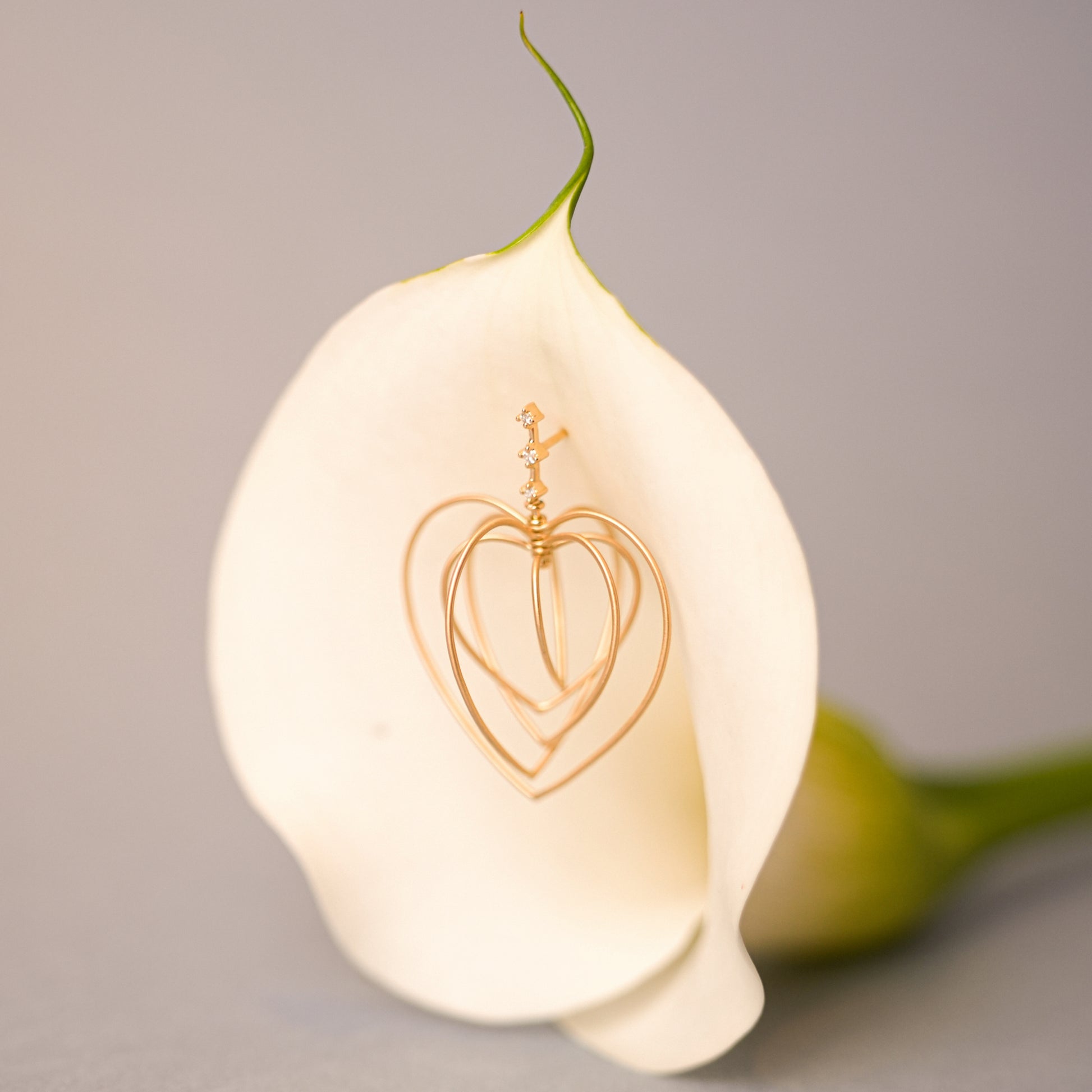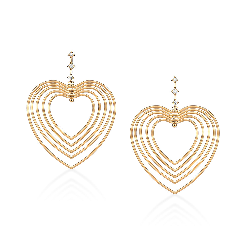 O Brinco Malabaris Coração G é confeccionado em ouro 18k. Seu design traz cinco fios redondos de ouro em formato de coração, todos feitos manualmente, criando uma composição leve e cheia de movimento. A inspiração no nome Malabaris se revela no balanço fluido das formas. No topo, 0.07 ct de diamantes adicionam brilho sutil à peça. O acabamento fosco confere uma textura contemporânea, que contrasta com o brilho dos diamantes. Com aproximadamente 4 cm de comprimento, o modelo também conta com uma versão menor, de 3cm.