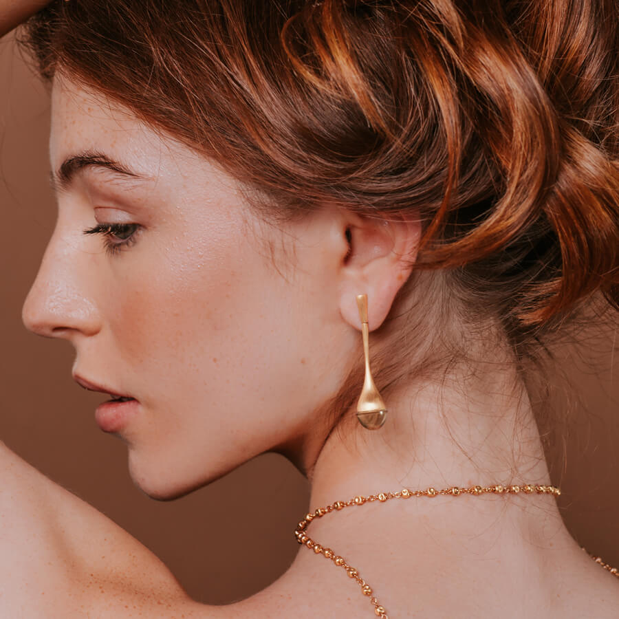 A diretora criativa Alessandra Schiper se inspirou no movimento de uma gota d’agua caindo verticalmente para idealizar esse brinco. A lapidação da pedra no formato de cabochon destaca o momento exato que a gota se forma.