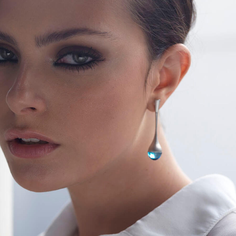 A diretora criativa Alessandra Schiper se inspirou no movimento de uma gota d’agua caindo verticalmente para idealizar esse brinco. A lapidação da pedra no formato de cabochon destaca o momento exato que a gota se forma.