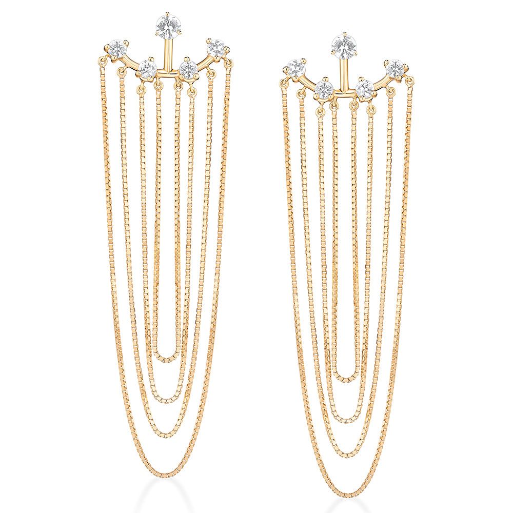 O Brinco Shinning é confeccionado em ouro 18k e combina a sofisticação das safiras brancas com a leveza da corrente veneziana. As pedras, cuidadosamente cravadas, formam um desenho delicado e luminoso na orelha, enquanto as correntes de múltiplos tamanhos criam um movimento elegante e fluido. Um modelo que une brilho e leveza, perfeito para elevar qualquer composição com impacto e sofisticação.