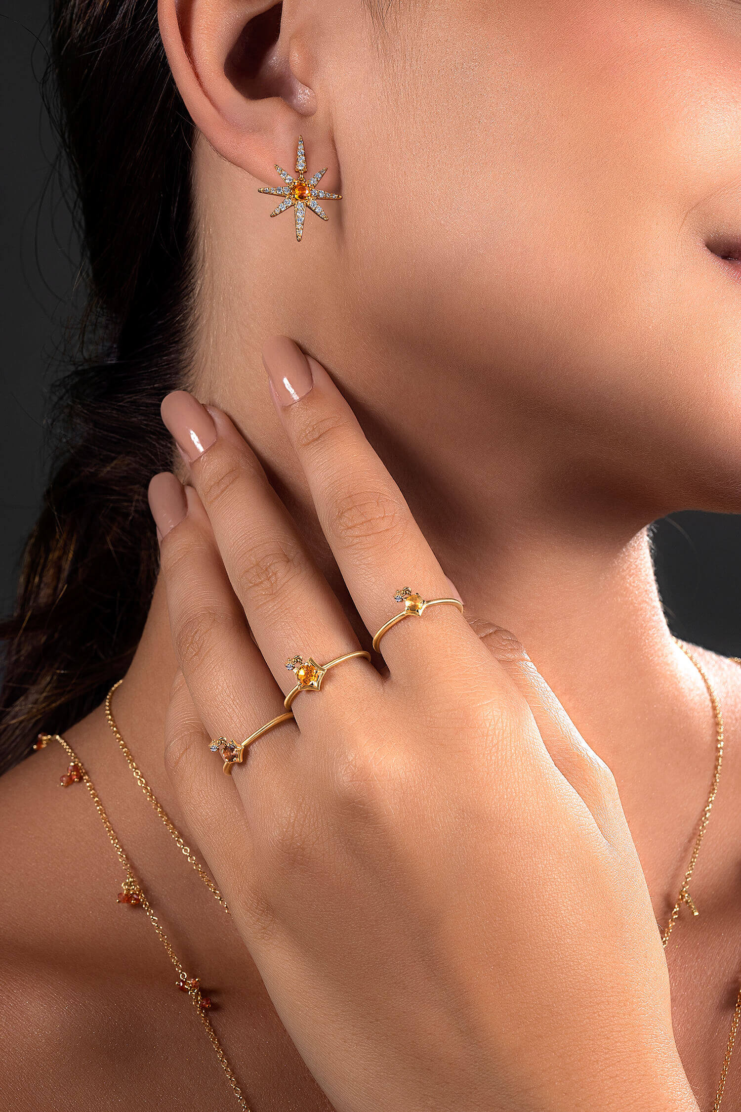 Brinco em ouro 18k amarelo com safira laranja e brilhantes de 0,52ct. Mede 2cm de comprimento.
