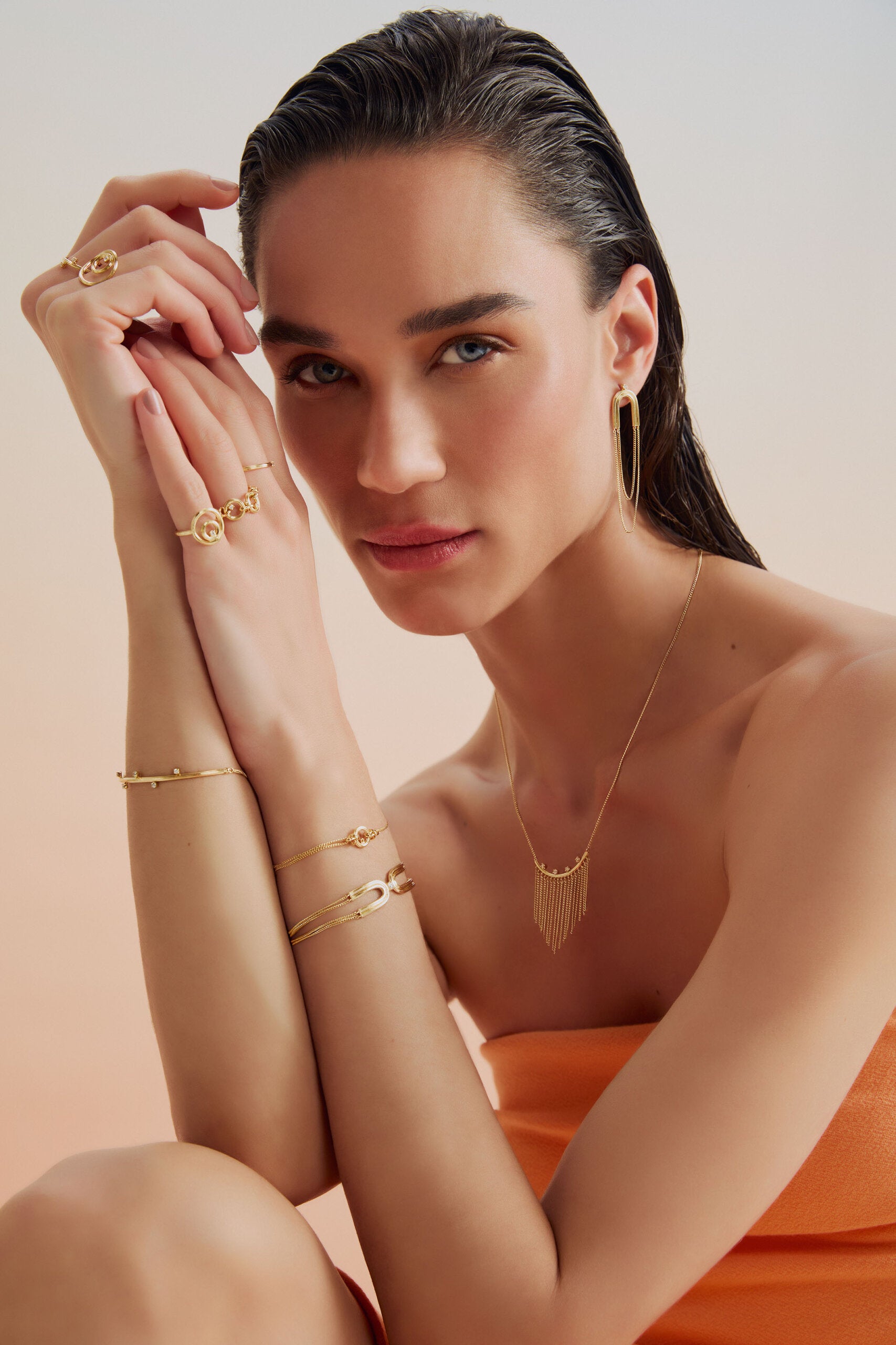 A coleção Golden Hour é inspirada na magia dos raios solares durante a hora dourada, quando a luz cria sombras suaves e transforma tudo ao redor com um brilho único. Feitas com fios raiados e detalhes que evocam movimento e fluidez, as joias desta coleção capturam a leveza e a harmonia desse momento especial.