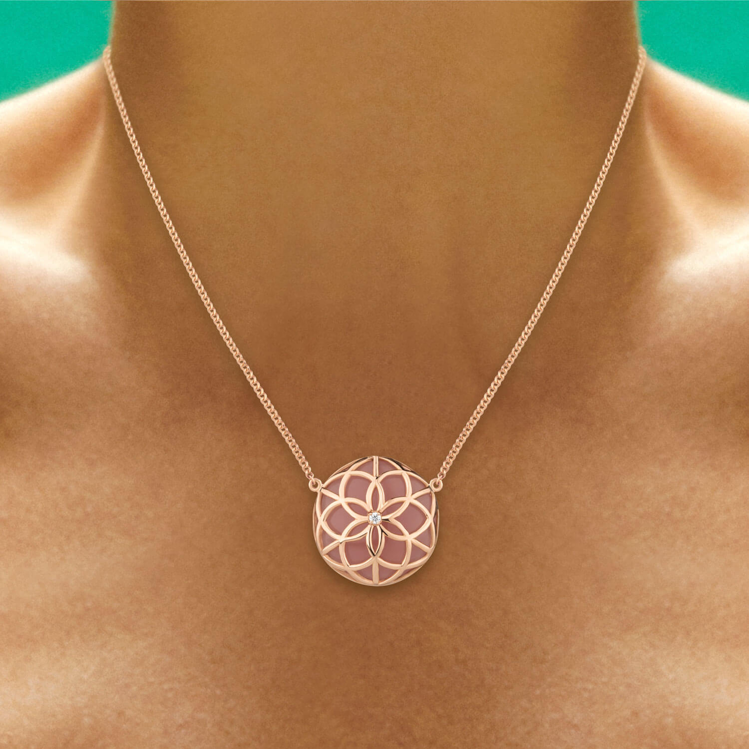 Colar em ouro 18k rosa com brilhante e quartzo rosa.