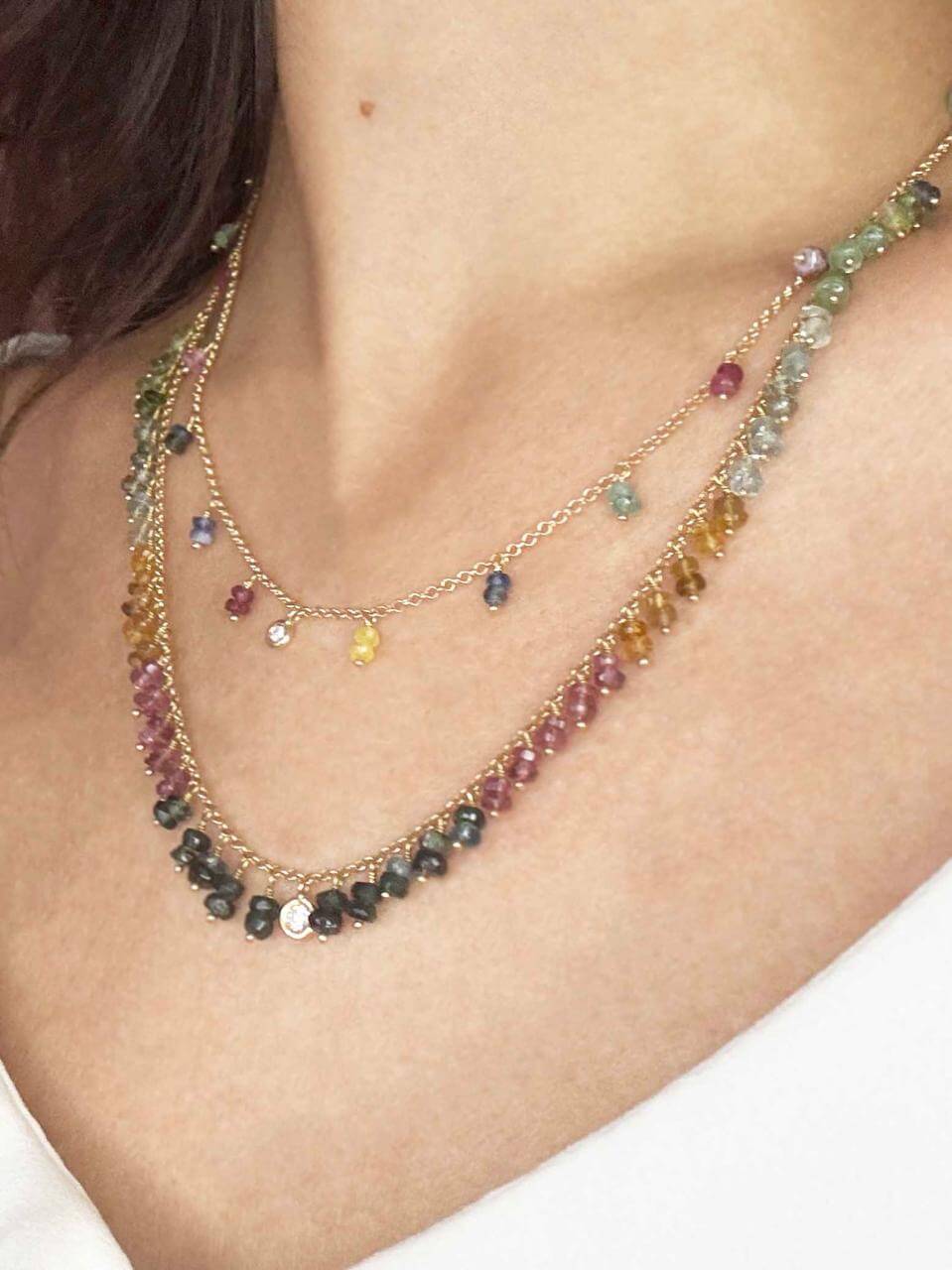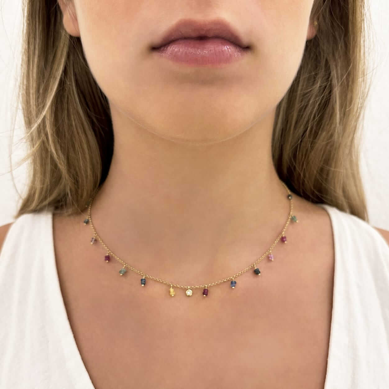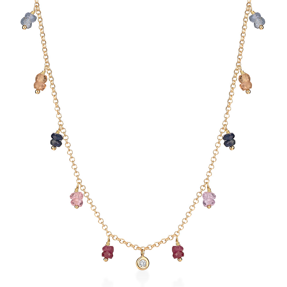 Colar em ouro 18k amarelo com safiras coloridas e 0,03ct de brilhantes.