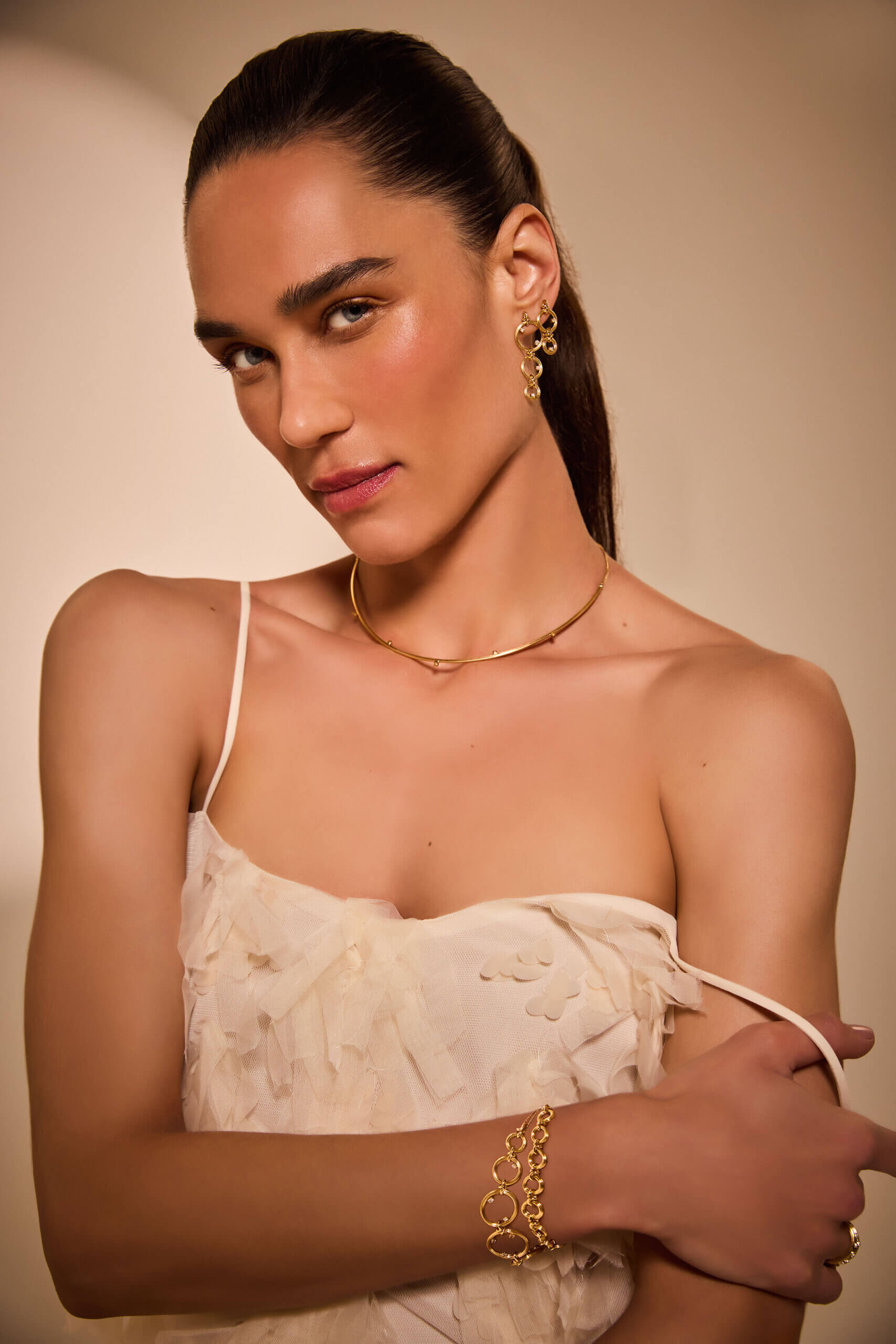 A coleção Golden Hour é inspirada na magia dos raios solares durante a hora dourada, quando a luz cria sombras suaves e transforma tudo ao redor com um brilho único. Feitas com fios raiados e detalhes que evocam movimento e fluidez, as joias desta coleção capturam a leveza e a harmonia desse momento especial.