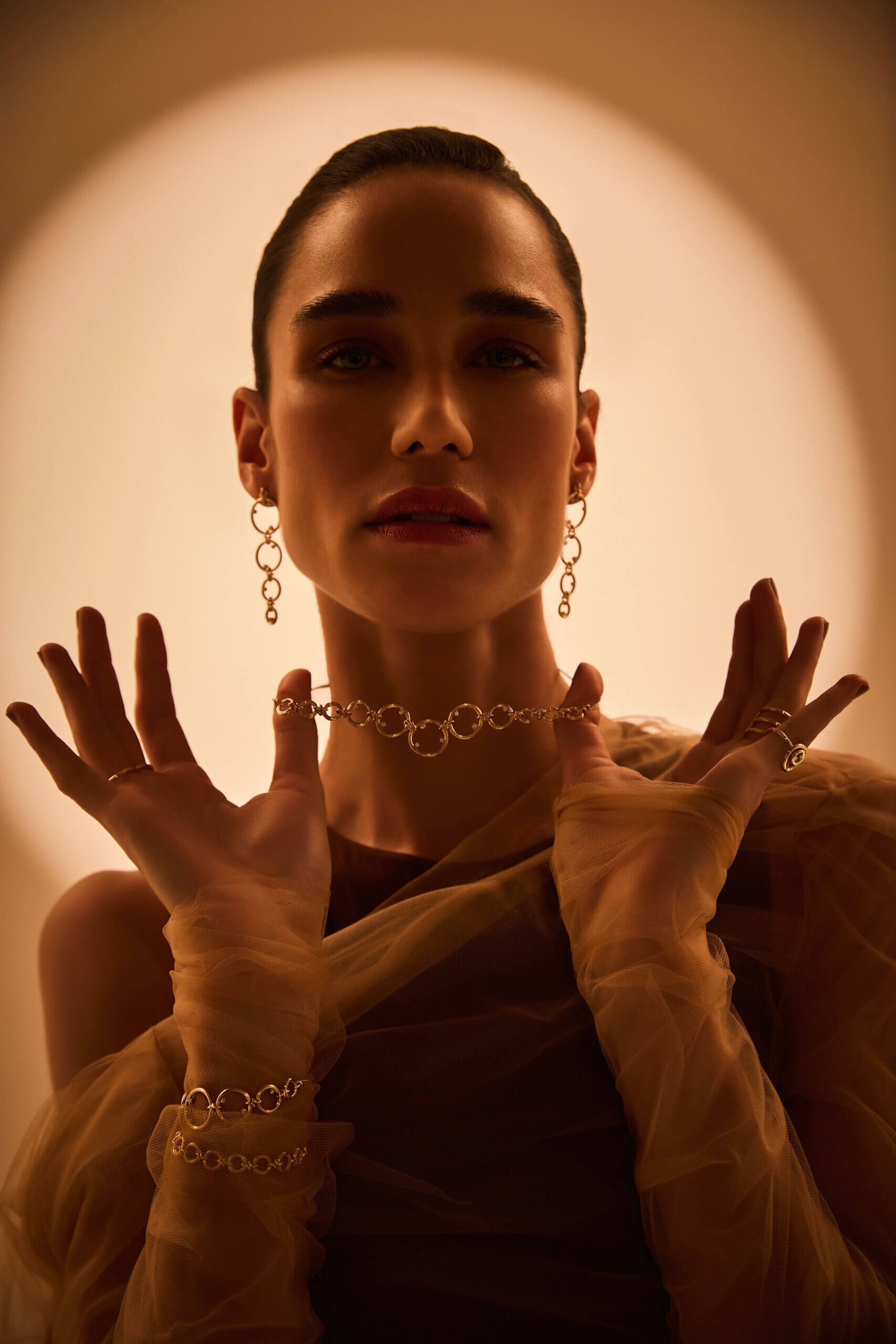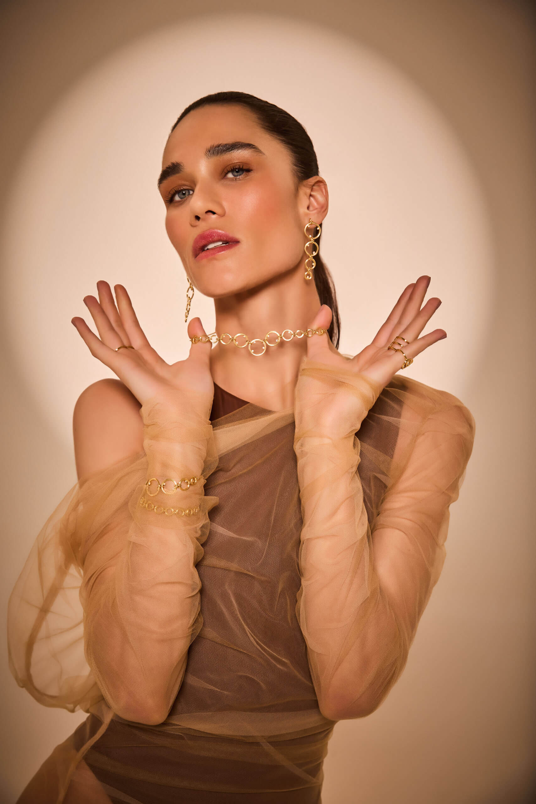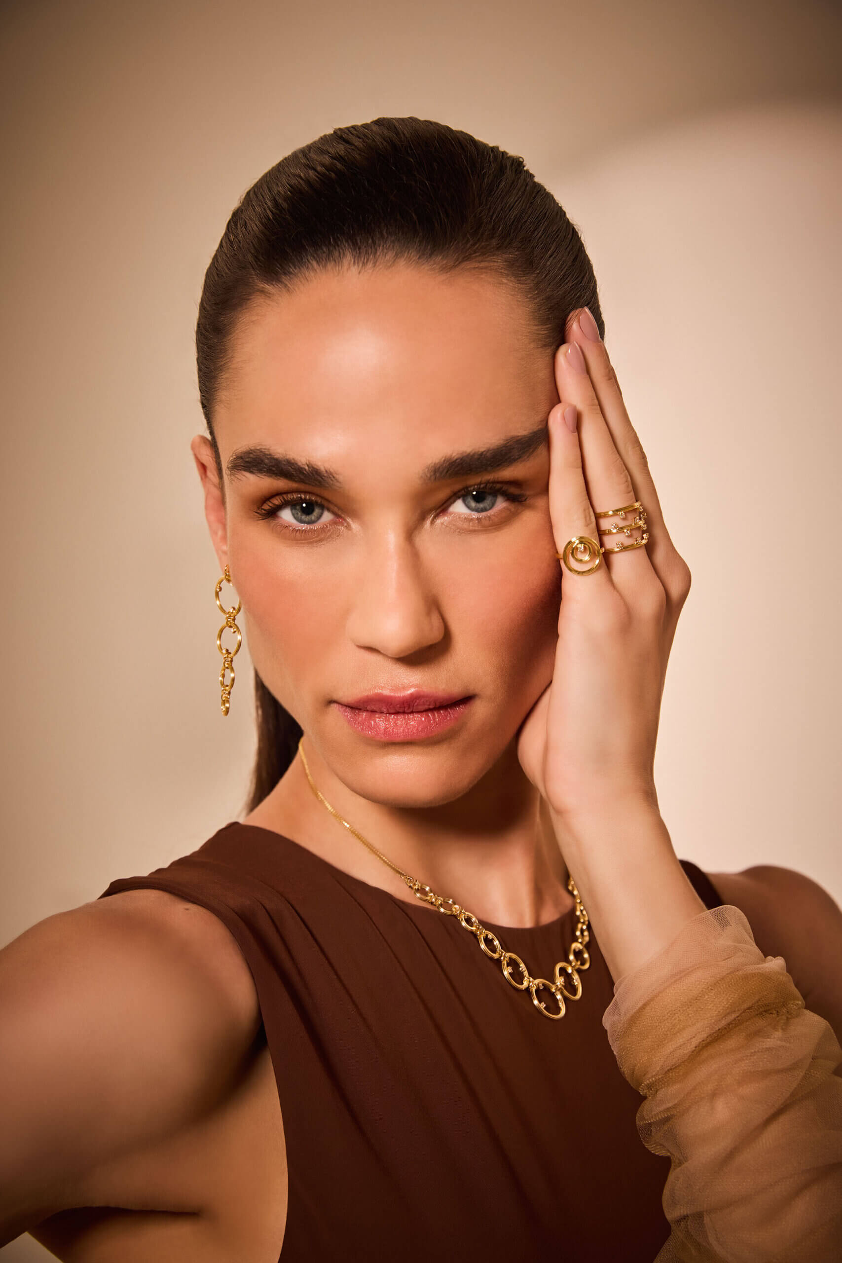 A coleção Golden Hour é inspirada na magia dos raios solares durante a hora dourada, quando a luz cria sombras suaves e transforma tudo ao redor com um brilho único. Feitas com fios raiados e detalhes que evocam movimento e fluidez, as joias desta coleção capturam a leveza e a harmonia desse momento especial.