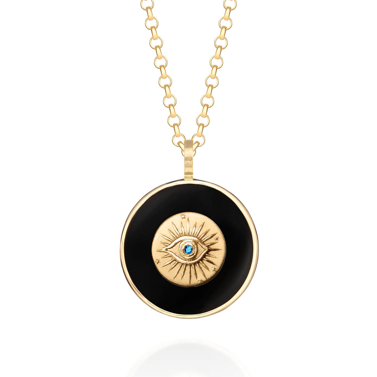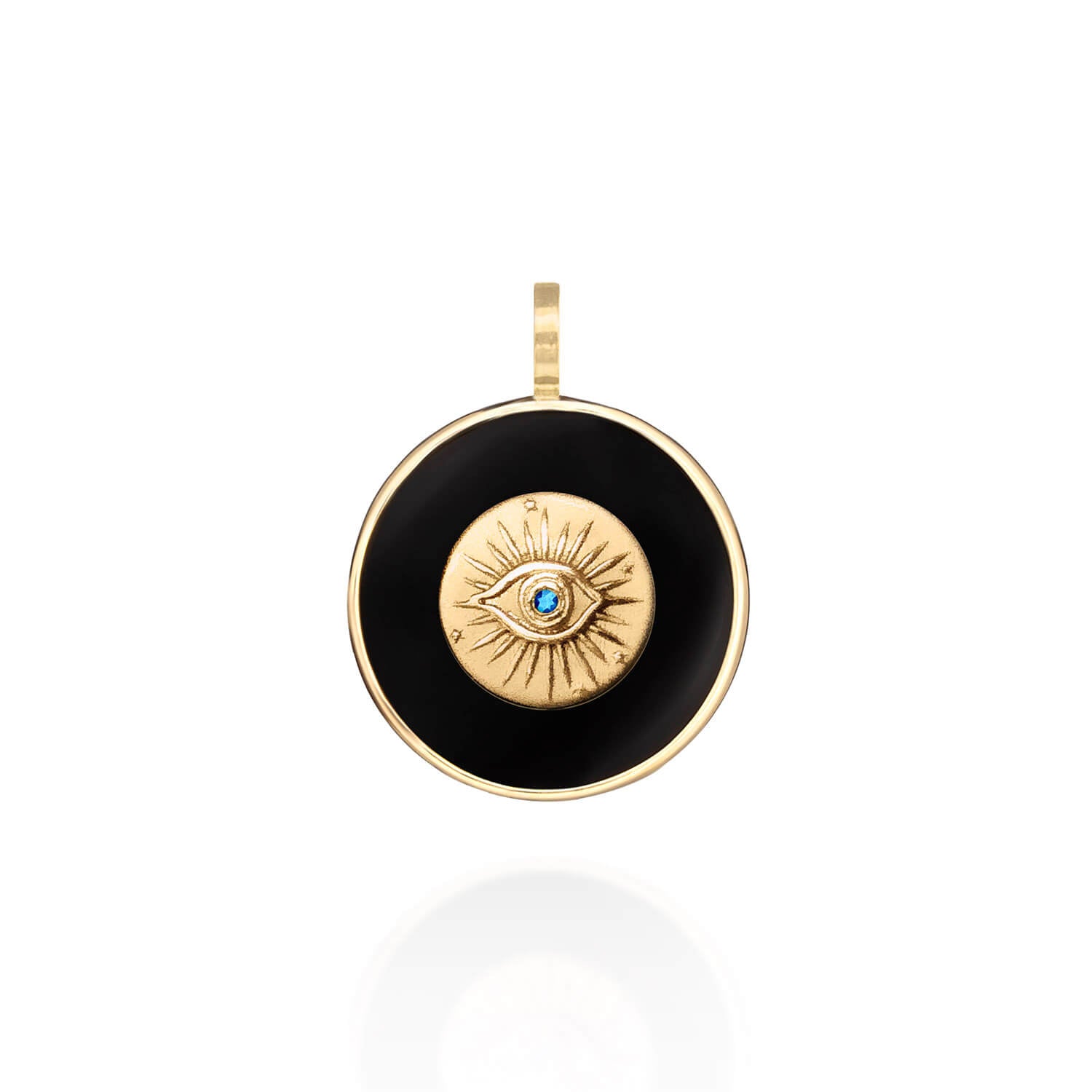 Pingente em ouro 18k amarelo com ônix, brilhante azul no centro.