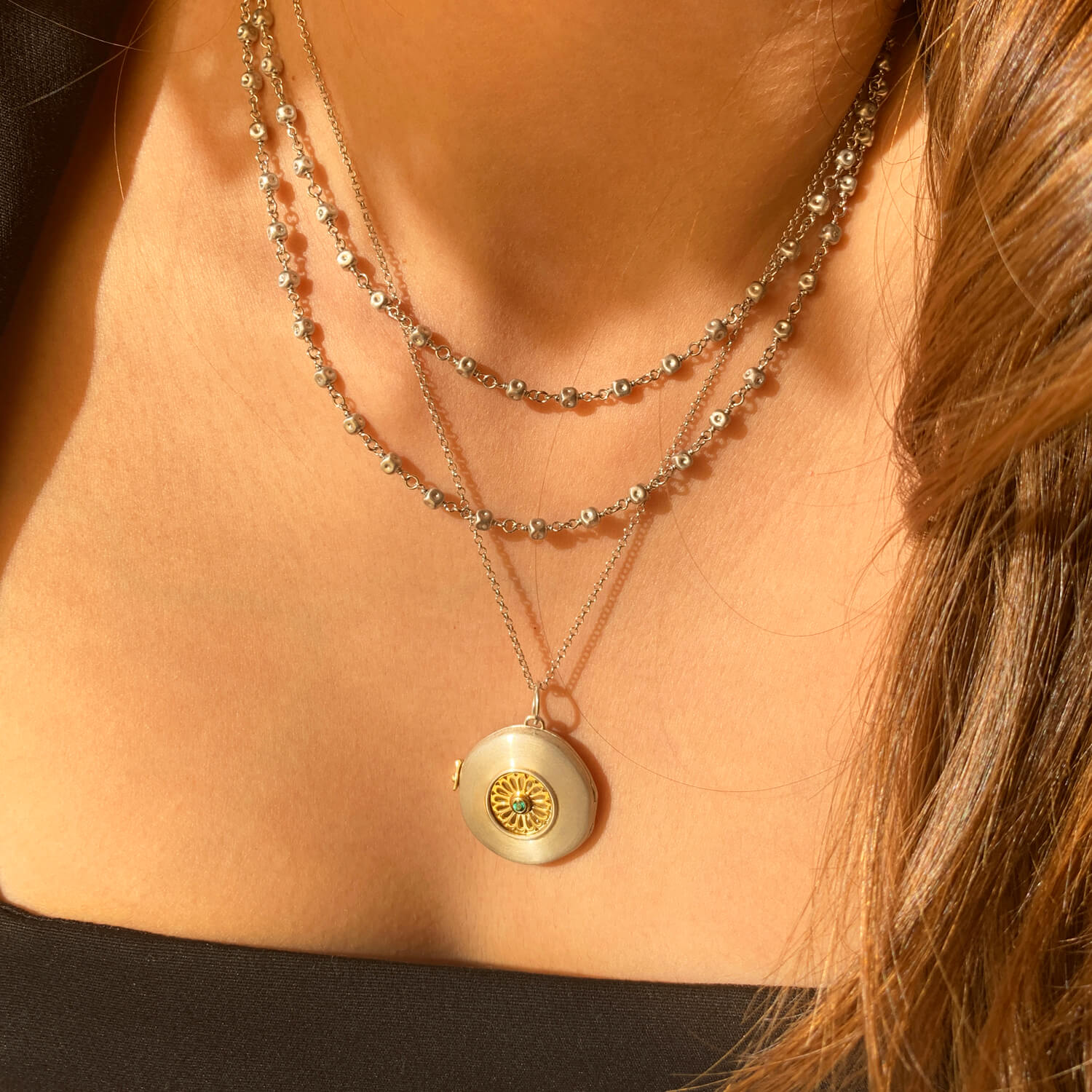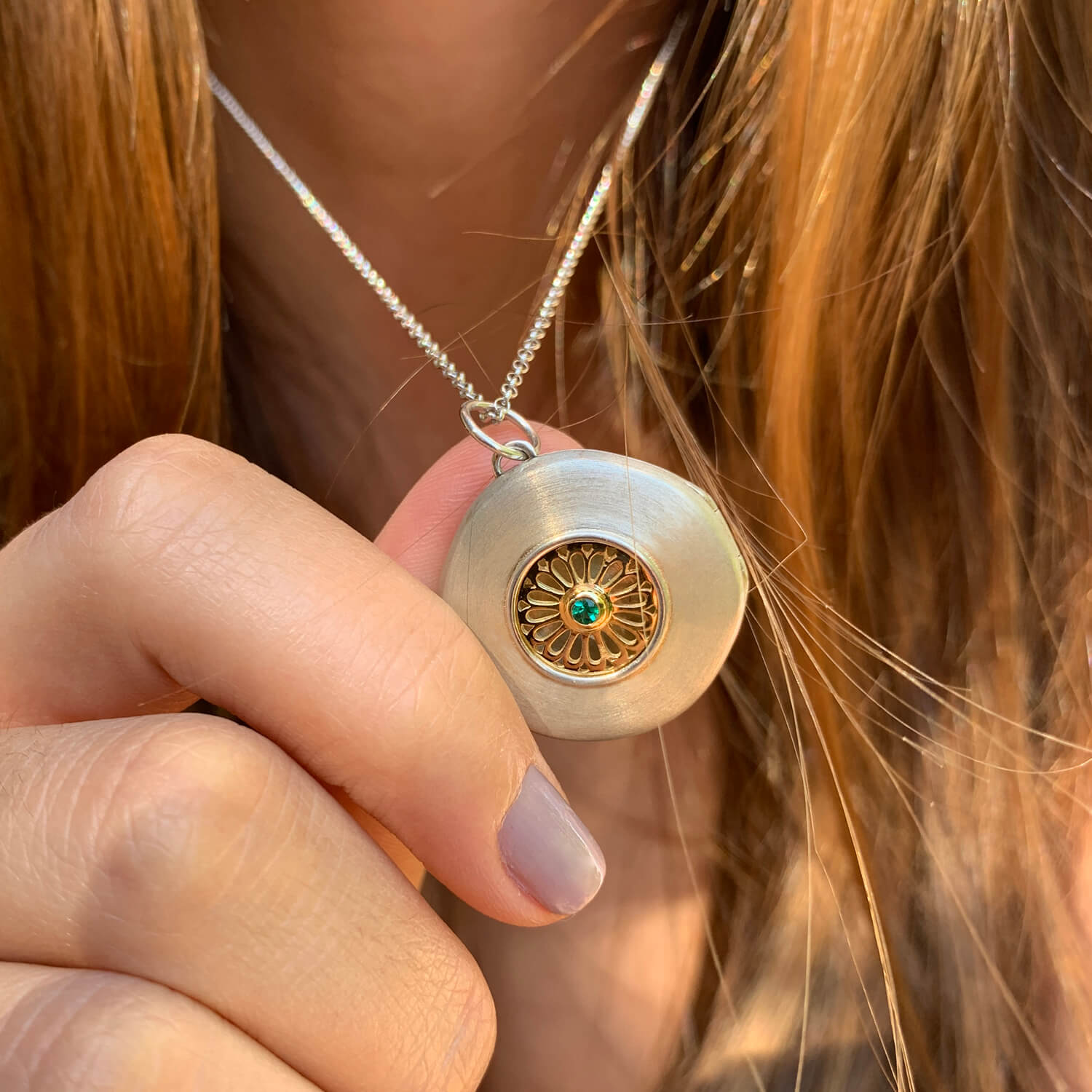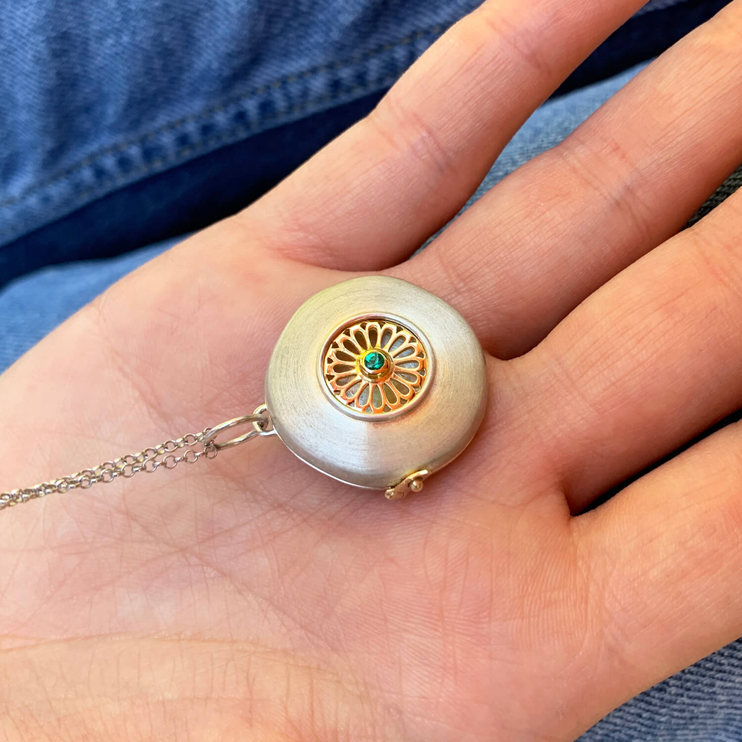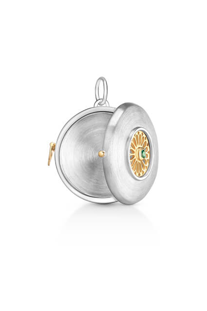 O Relicário é feito em prata 925 com ouro 18k amarelo, e tem 1 Esmeralda central de 0,03cts.