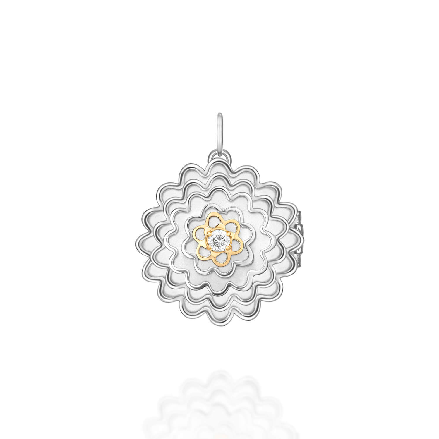 O Relicário é feito em prata 925 com ouro 18k amarelo, e 1 diamante.